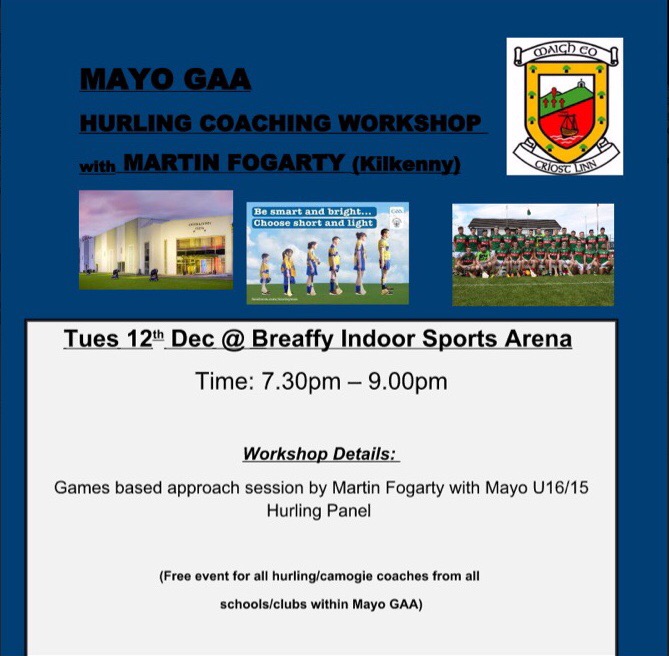 Enclosed find details of the upcoming Mayo GAA Martin Fogarty Hurling Coaching Workshop which will take place on Tuesday 12th December from 7.30pm until 9.00pm in The Breaffy Indoor Sports Arena. The Mayo U16 Hurling Development Panel will be coached during the Workshop on the night, as National Coaching Director Martin Fogarty delivers his Workshop on ‘Games Based Approach to Hurling Coaching’.